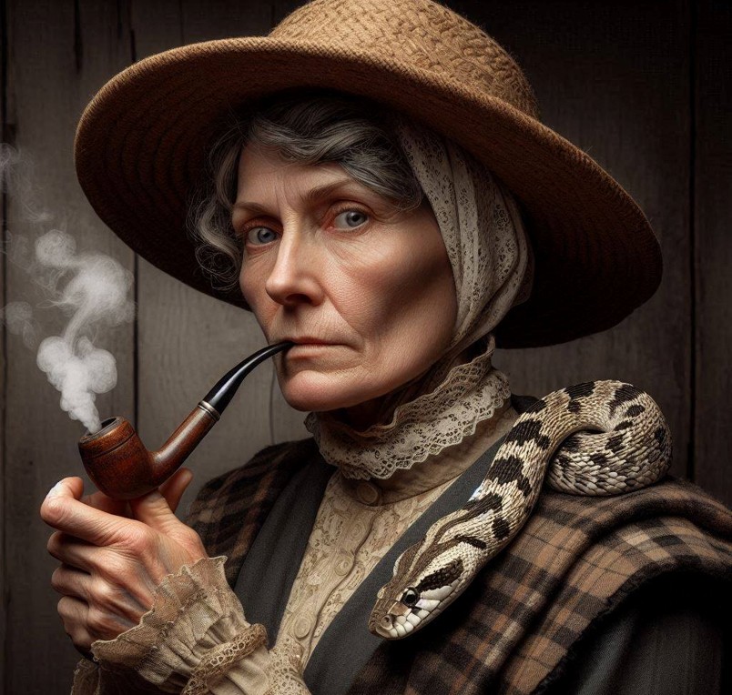 Her name was Nancy Pullum. She caught rattlesnakes and made them into a medicinal oil that she sold to her neighbors. Herbert Barbee told Dr. Wayland that Nancy was fierce looking, smoked a pipe, was rough and tough, and had a heart of gold. I like to imagine her like this: